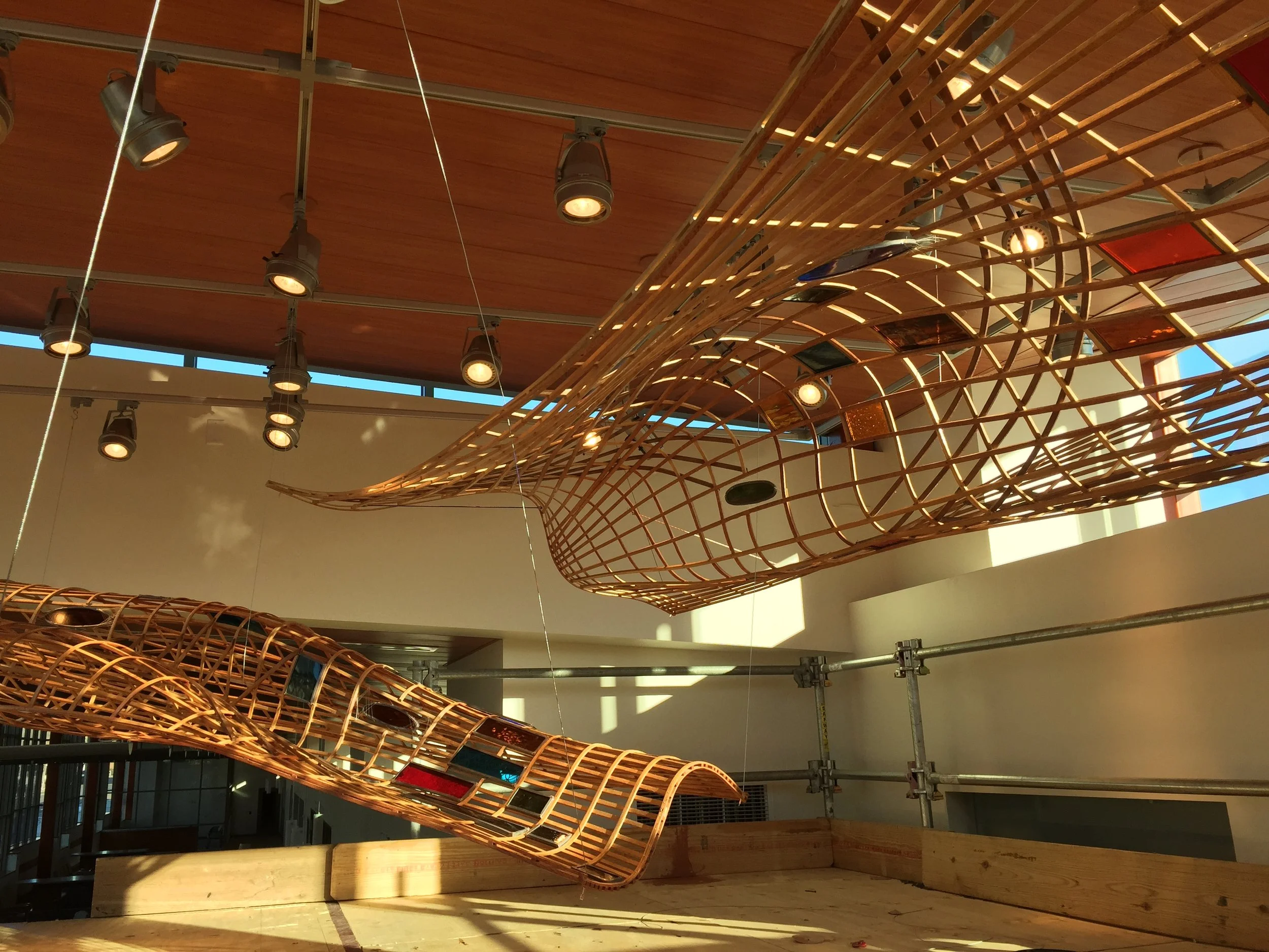 Like a woven cloth comprised of individual fibers, this wellness center thrives through every community member. Pieces of cloth with significance to the community are preserved through stained glass, sculpture, video, light, painting, and water features. Whether depicting a cherished item of clothing, a washcloth used to wipe a brow, a blanket that warms, or a beloved quilt passed down from a grandmother, the artwork offers steadfast reassurance and repose to those on a path toward wellness.
